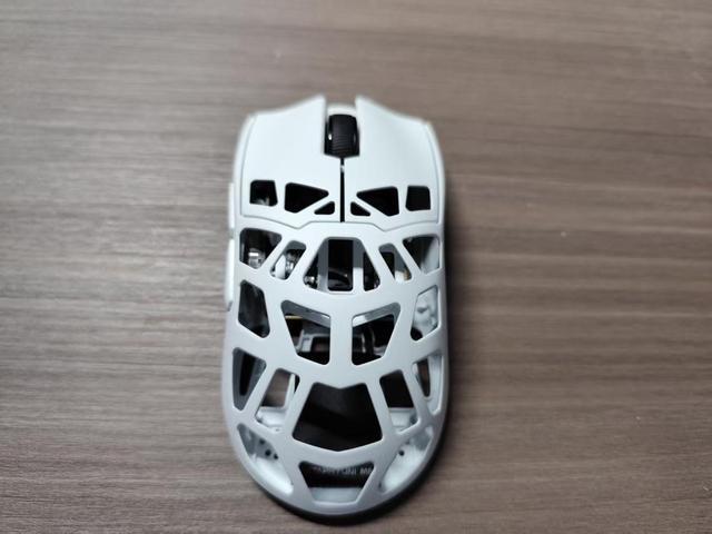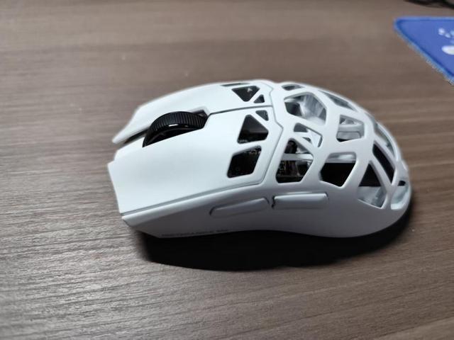 玄派 M6 的第一眼就让人印象深刻。它采用了类毒蝰minise的模具,但在细节上做了全面优化,最抢眼的就是大面积的镂空设计。不同于市面上常见的半镂空或局部镂空,这款鼠标的正面几乎被几何线条构成的镂空图案覆盖,光线透过时能形成独特的光影效果,放在桌面上宛如一件极简主义的数码艺术品。