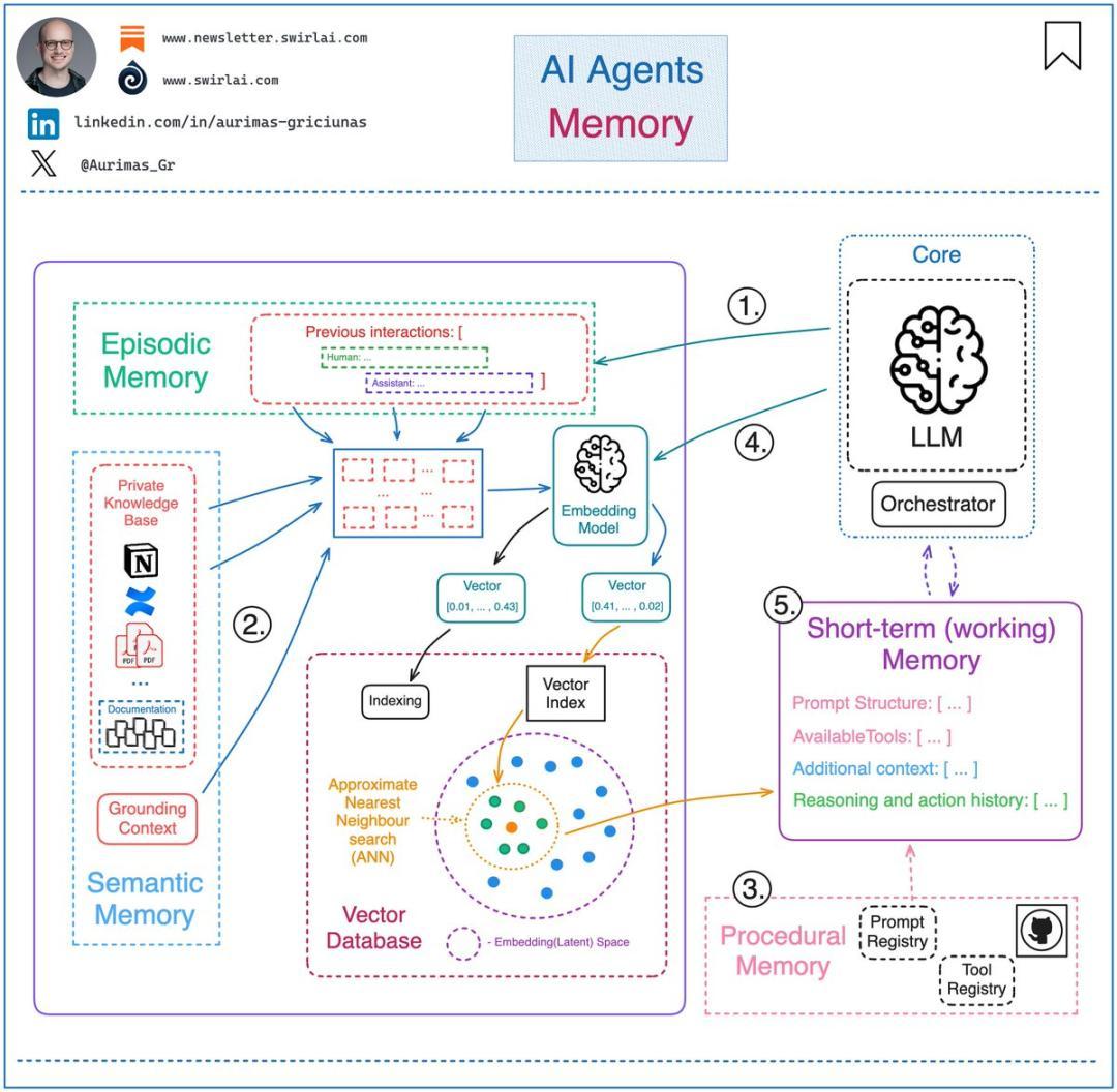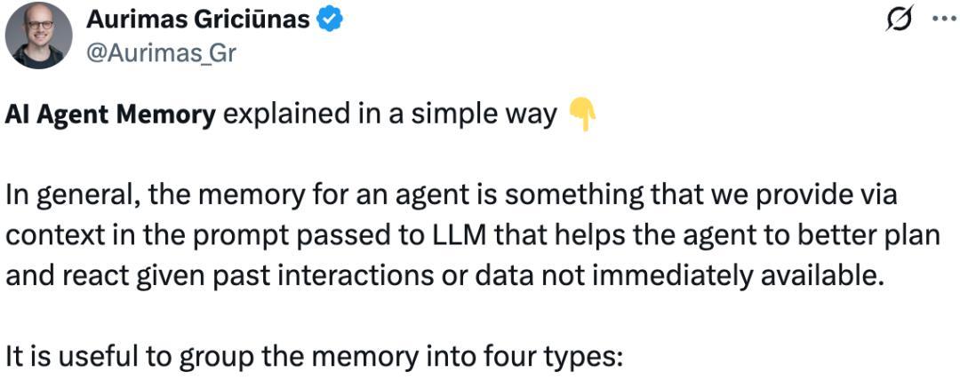 SwirlAI 创始人兼 CEO Aurimas Griciūnas 认为,可以将 LLM 的记忆分为以下类型: