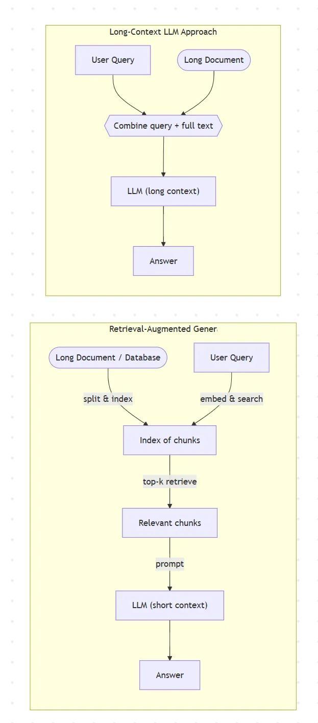 图中对比 RAG 流程与纯长上下文方法的差异,RAG 效率高,但可能遗漏间接上下文;长上下文使用虽然全面,但需要模型处理非常大的输入。