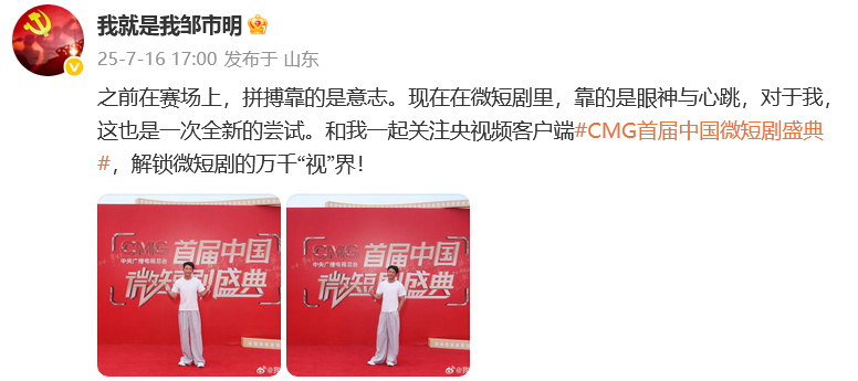 他晒出自己走红毯的图片写道:“之前在赛场上,拼搏靠的是意志。现在在微短剧里,靠的是眼神与心跳,对于我,这也是一次全新的尝试。”