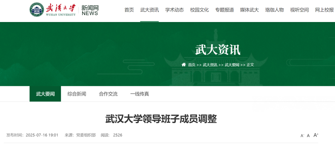 武汉大学官网消息,7月16日,武汉大学召开党委常委会(扩大)会议,宣布中共中央、国务院和教育部党组关于学校领导班子调整的有关决定。经党中央批准,宋保亮任武汉大学常务副校长(试用期一年),周伟任武汉大学党委常委、副校长(试用期一年),免去李资远的武汉大学副校长职务。