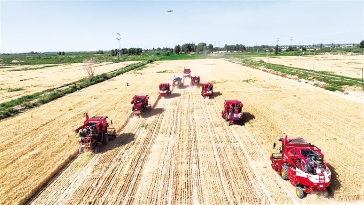 近日,金塔县10万亩小麦陆续进入成熟期。在金塔县东坝镇小河口生态健康农业万亩粮食节水生产基地,数台大型联合收割机开始收割小麦,确保夏粮颗粒归仓。