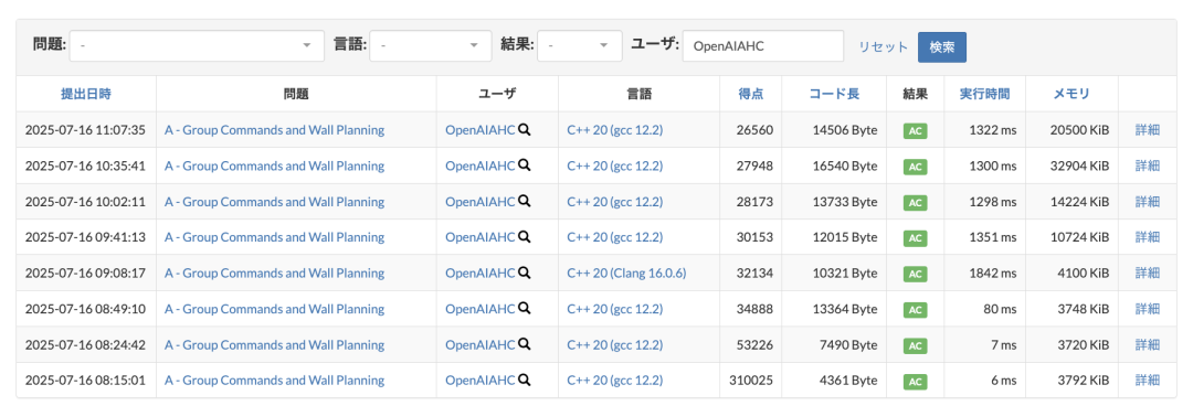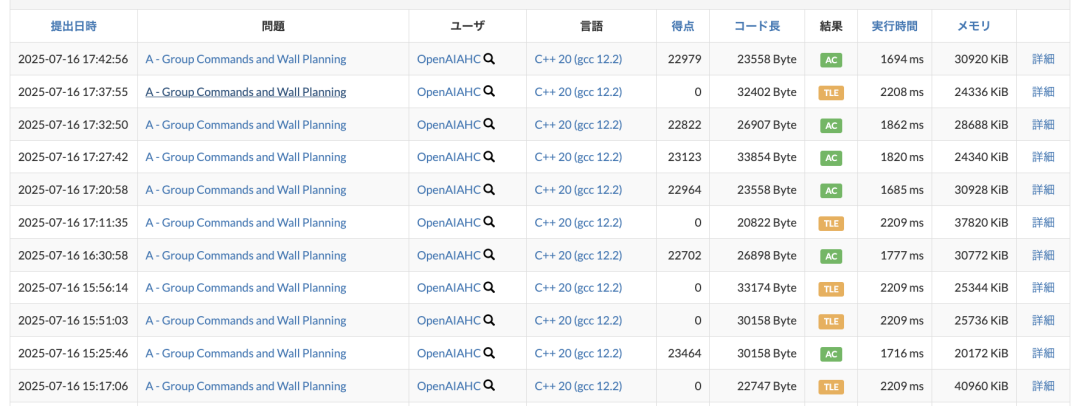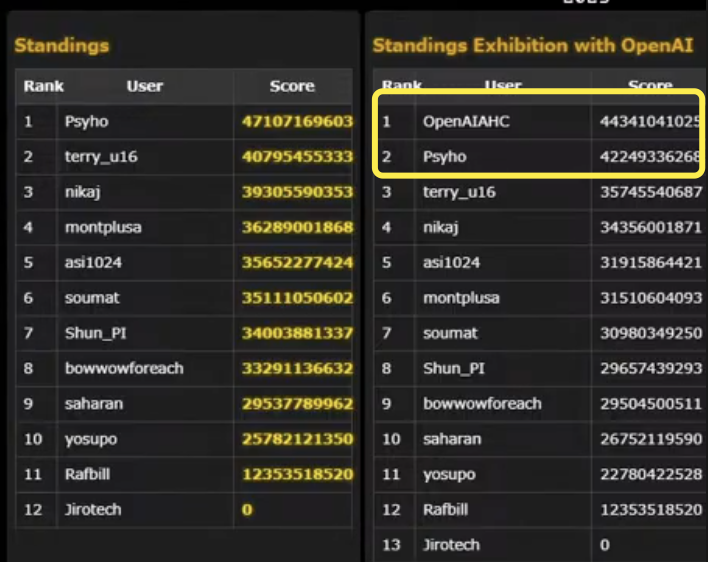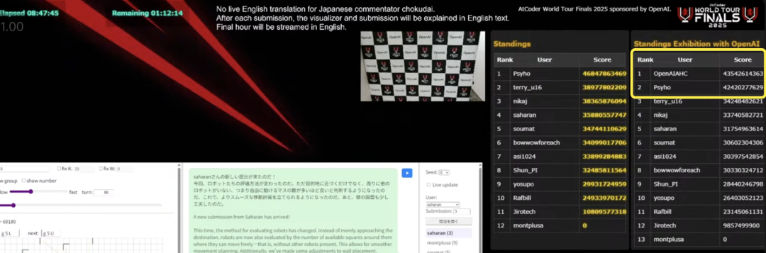 此次比赛全程直播。OpenAI参赛的模型叫做OpenAI-AHC,从提交的记录来看,前期发挥得都很不错。