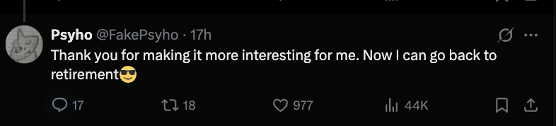 此次对于Greg的祝贺,他回应道,谢谢你让我的生活更有趣,现在我回去准备退休了。