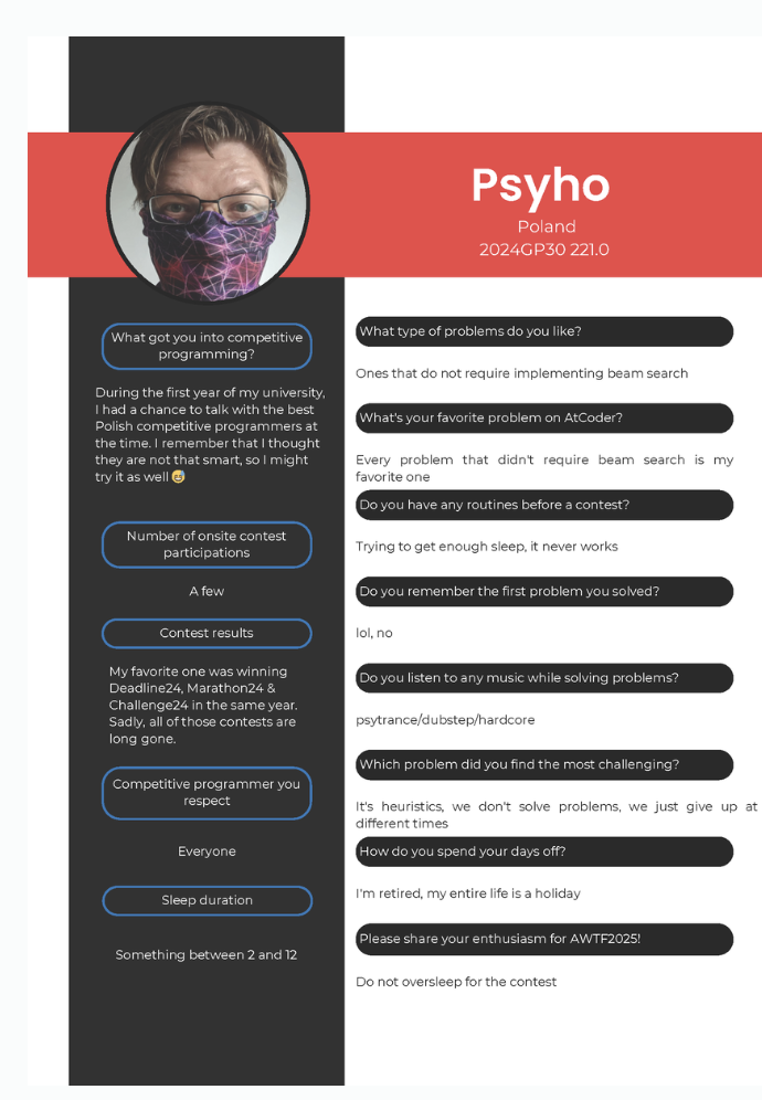 它有两种类型的竞赛:算法类和启发式,OpenAI参与的是后者,与12位优异人类同台竞技。每位选手都有个这样的介绍卡片。