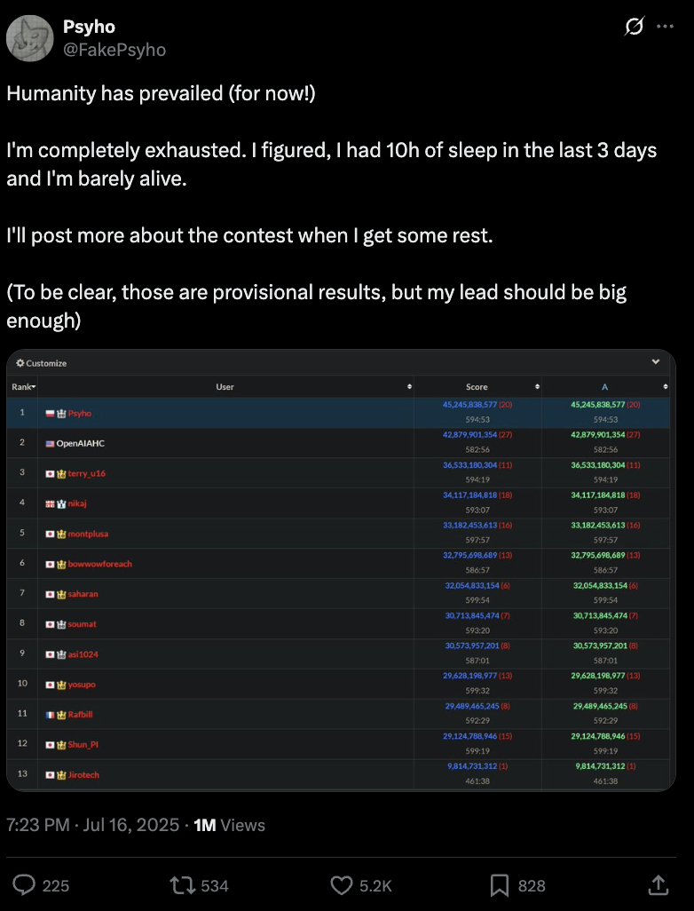 OpenAI 在大部分比赛中都排名第一,本以为就这样了。人类开始反超,结果还剩1小时20分钟的时候,OpenAI又重新领先。不过还是没有坚持到最后。