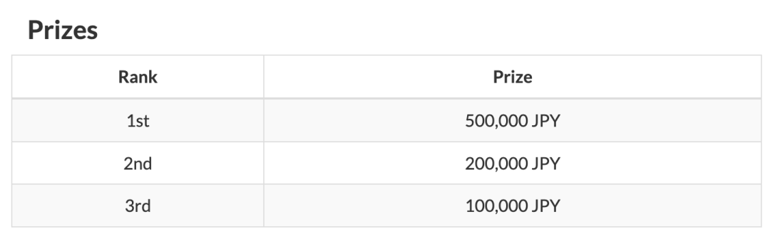 第一名可以获得50万日元,差不多两万四人民币。第二名能获得九千六百多元。