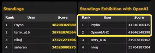 后面正如Greg所说,还剩下一个多小时的时候,OpenAIAHC再次反超。