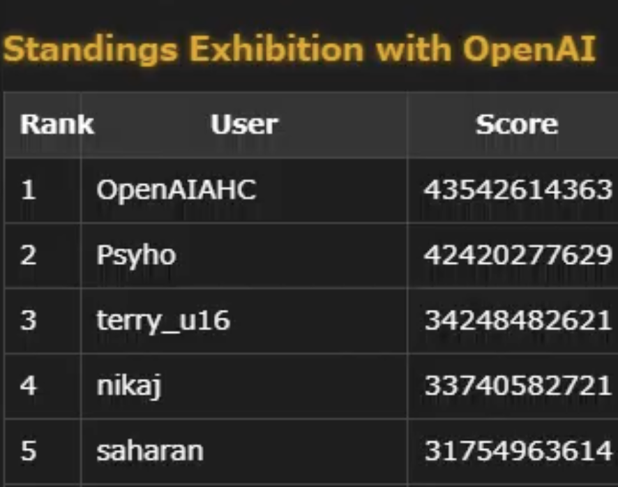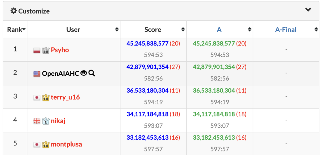 比赛还剩下三个小时的时候,OpenAI依然是稳居第一。