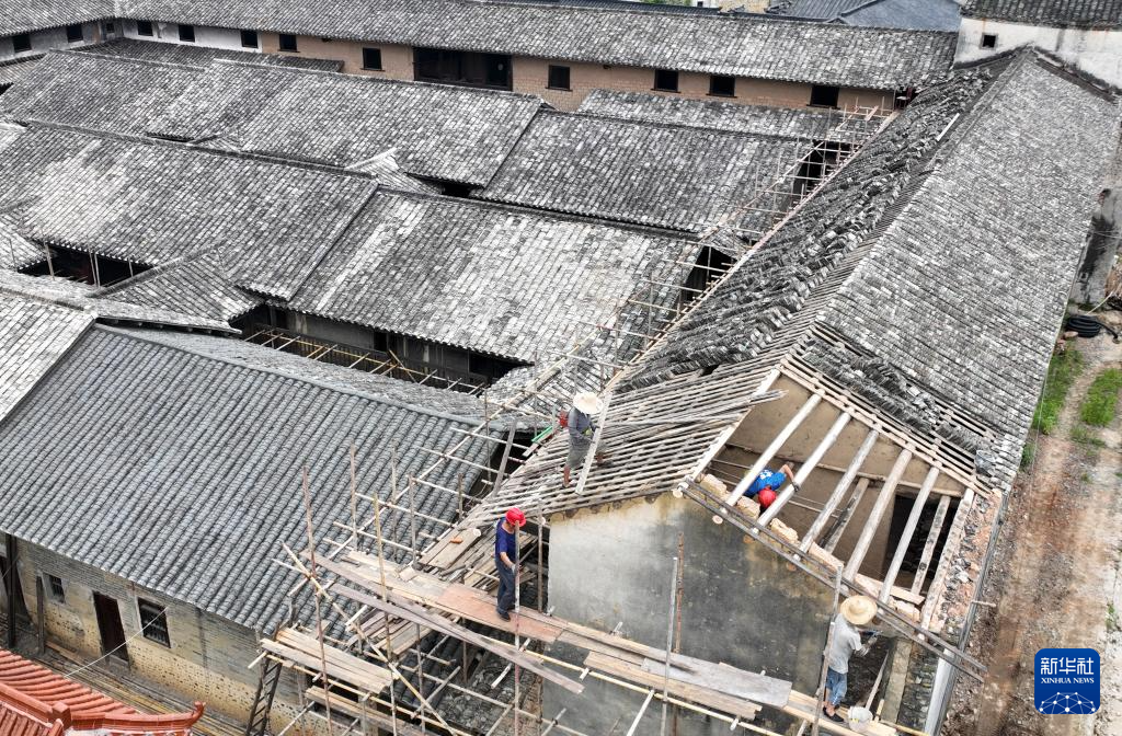 工人在修缮位于龙南市杨村镇的上新屋围(2024年8月28日摄)。