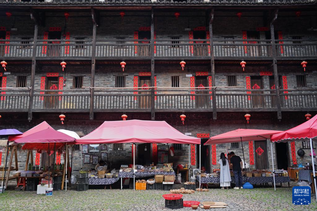 游客在龙南市杨村镇的燕翼围内选购村民的土特产(6月19日摄)。