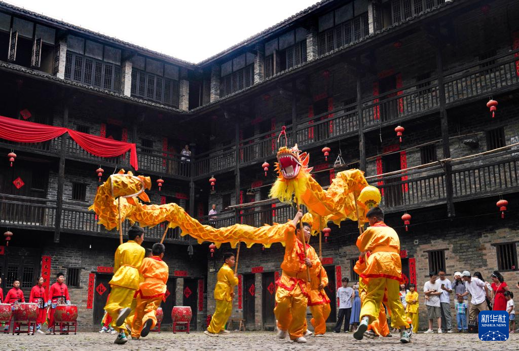 孩子们在龙南市杨村镇的燕翼围内进行舞龙表演(2024年7月31日摄)。