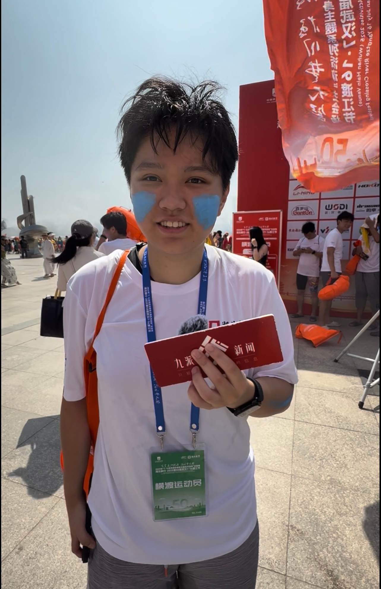 在赛场上,记者还注意到刚满18岁的李安琪同学。她脸上的物理防晒彩绘尚未褪去。当她向记者提及自己的呛水经历时,不禁笑出了声:“喊口号时没闭紧嘴,一口江水下去,居然有点甜。”