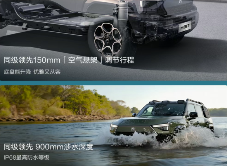 首先M817配备空气悬架,提供6挡可调,调节行程高达150mm,支持向上最高105mm可调节,向下最低45mm可调节,涉水深度可达900mm。
