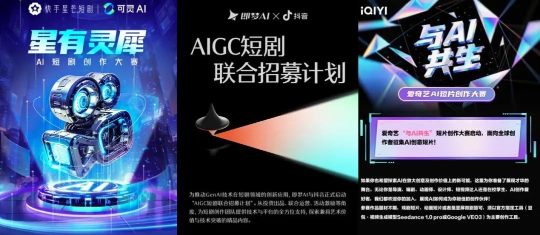各大平台也留意到了创作者们的热情,并积极提供扶持。比如抖音和即梦合作推出“AIGC短剧招募计划”提供收益保底、宣发资源扶持,并对精品剧目提供额外投资;快手星芒短剧联合可灵AI推出“星有灵犀——AI短剧创作大赛”,爱奇艺也和火山引擎、谷歌合作启动“与AI共生”短片创作大赛,向创作者提供流量、技术和资金的多维度支持,《山海奇镜》和《白骨精前传》等有一定影响力的AI仙侠短剧就是快手“AI短剧创作大赛”的获奖作品,并借该赛事获得了更多露脸机会。