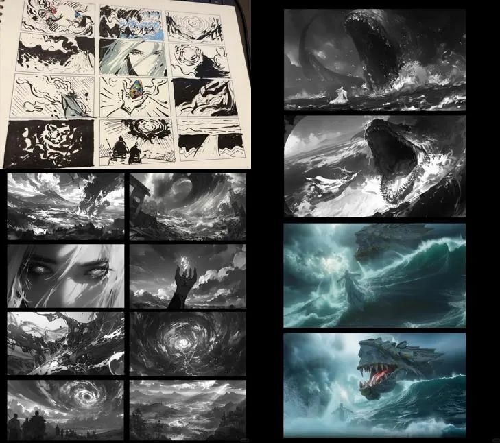 迈过剧本创作这一关之后,AI的存在感就越来越强了:剧本生成分镜图-图生视频-特效加工-后期剪辑成片等环节,AI都发挥了重要作用。