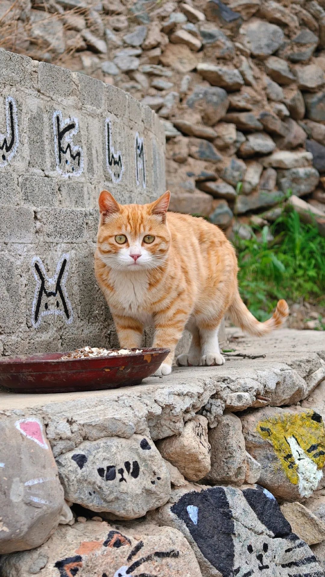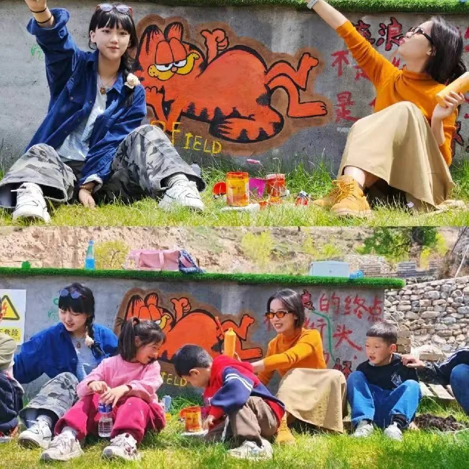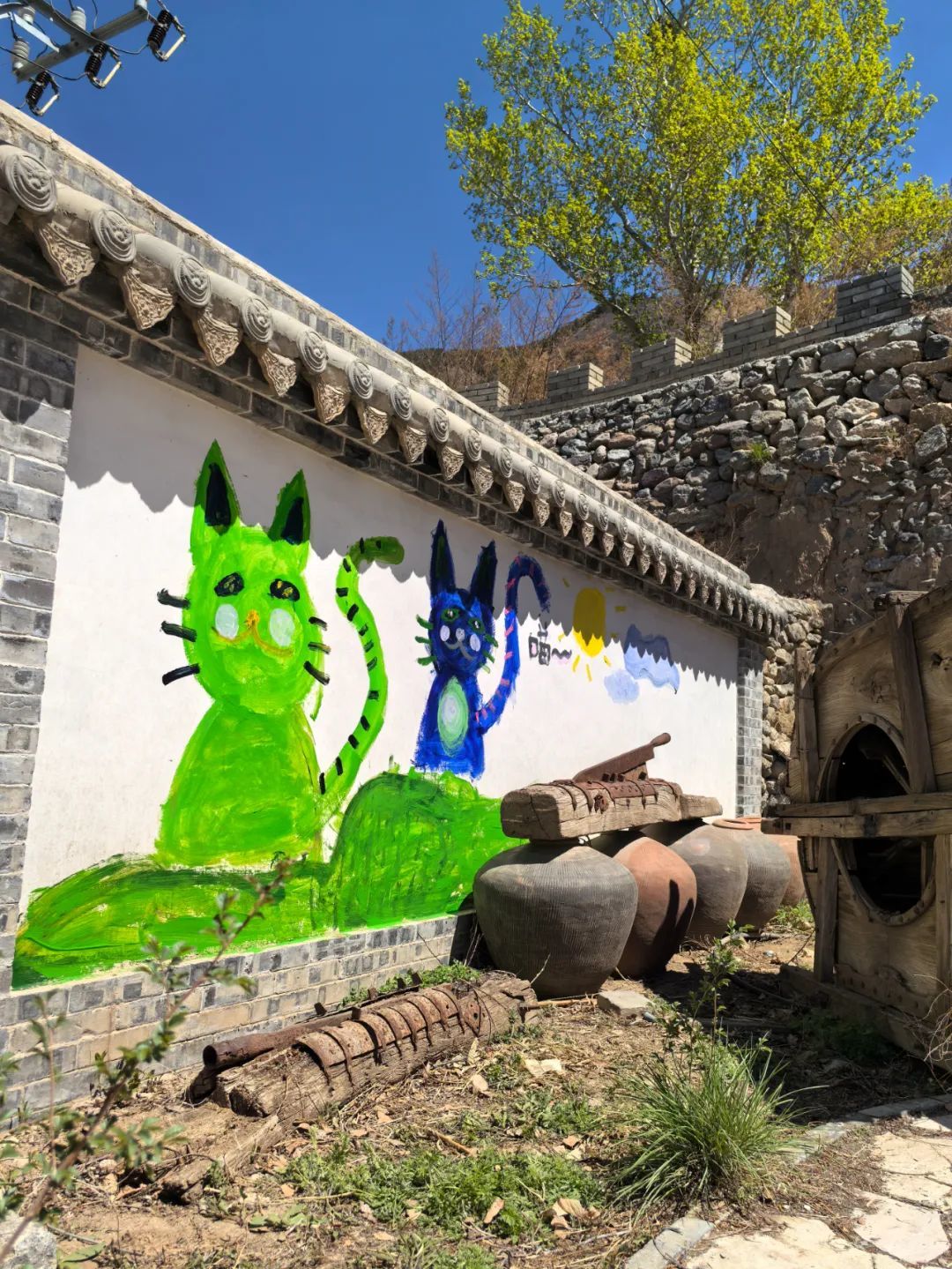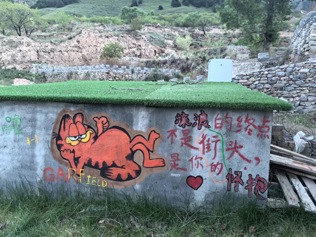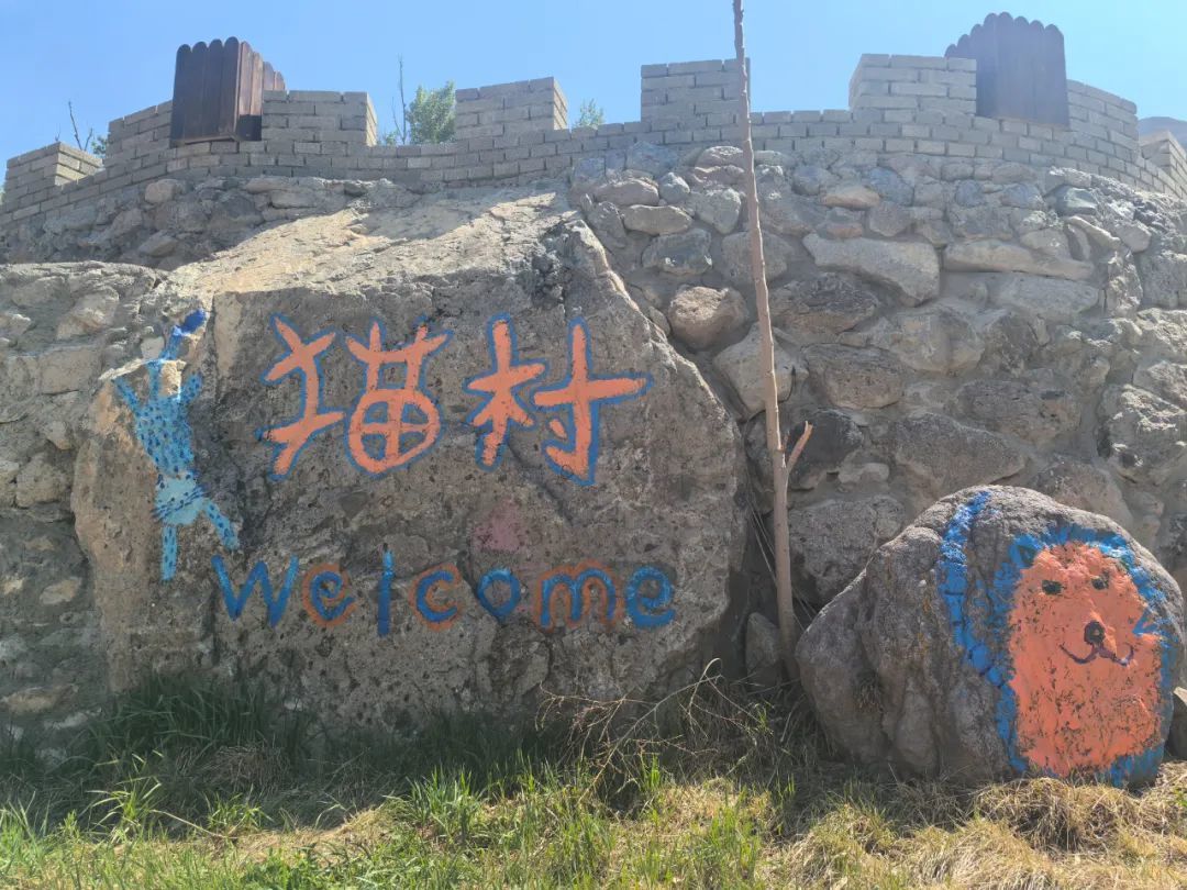 恰逢暑假,很多艺术生结伴来到这里,在墙壁上,在石头上,在猫山庄的门头上,留下许多猫画。