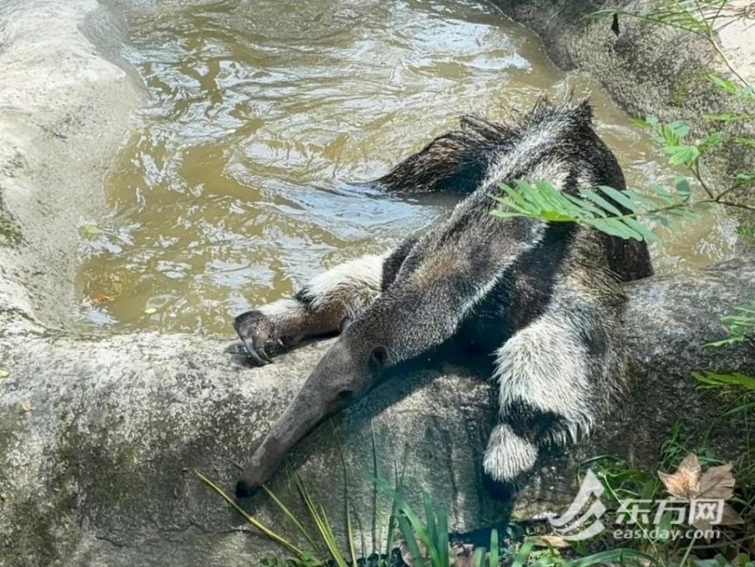 大食蚁兽对水特别偏爱,夏季展区内的水池成了泡汤玩水的“避暑胜地”,而它们还有特别的“泡汤三部曲”。进入水池后,大食蚁兽便开启了第一步全身清洁的“工程”。通过对毛发皮肤反复地搓洗,大食蚁兽能够有效去除身上的污垢与寄生虫,保持皮肤的健康与清洁。大食蚁兽会躺倒在湿润的泥土上欢快地翻滚,这层泥土其实是大食蚁兽的皮肤保护膜,能起到保持皮肤湿润、防止蚊虫叮咬的作用。