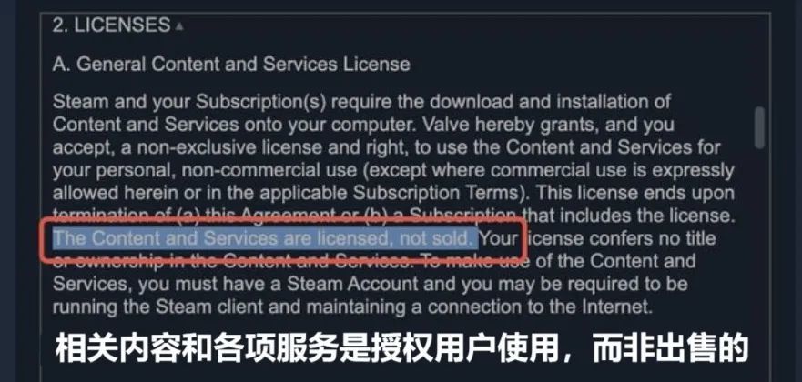 V社面对玩家的质疑,丝毫不怂,直接指出用户协议明确规定,Steam相关账号和其中的游戏(游玩权限)不可转让,哪怕玩家明确在遗嘱中写有“我将账号赠送给XXX”,Steam也无法为这个人提供合法的访问权限,更不能将逝世的玩家游戏库内容与另一个指定账号合并。