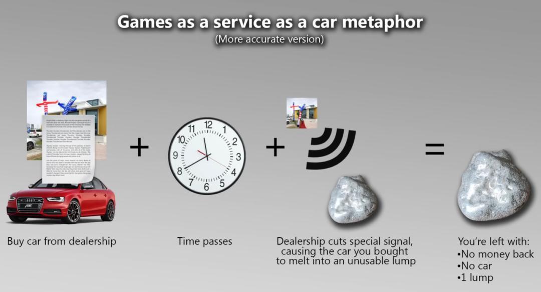 斯科特认为,这实际上就是一种“计划报废”行为,资本家有意为产品设计有限的使用寿命,令产品在一定时间后寿终正寝,从而减少自己的售后成本,并逼迫消费者“换新”。他不明白的是,在其它行业,计划报废被严格限制,为什么到游戏这儿就变得理所当然?假设你买了台车,需要车企发出特殊的信号才能运行,然后车企过一阵子,就把信号掐了,既不退你钱,又让你的车变砖,那估计消费者能把车企总部冲烂……