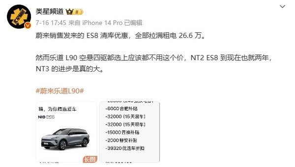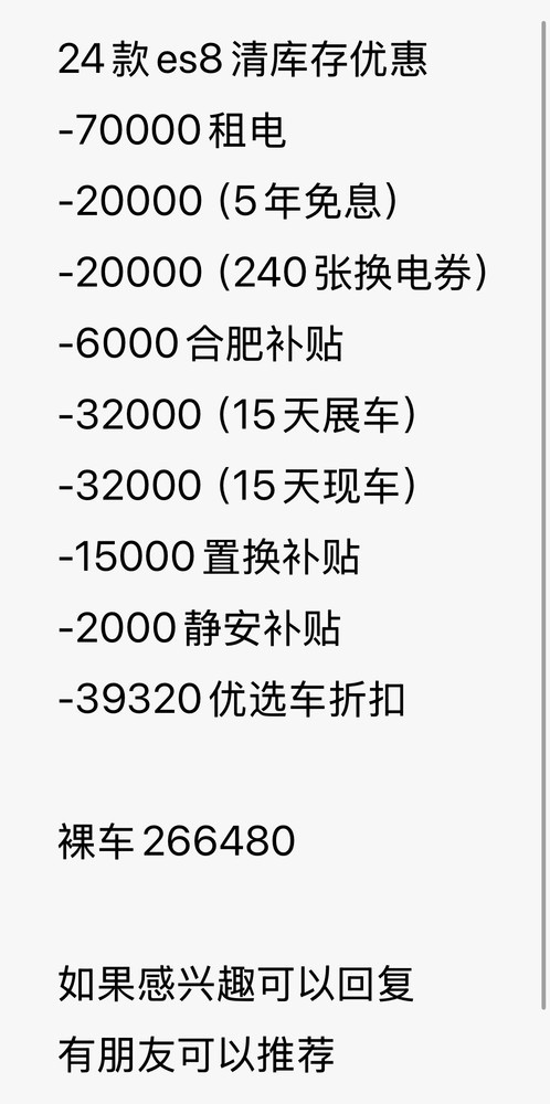 【CNMO科技消息】近日,有汽车博主曝光蔚来针对2024款ES8推出的清库优惠:通过租电模式叠加多重补贴,裸车价低至26.6万元。根据曝光的销售政策明细,优惠包含7万元租电减免、 2.4万元换电券(240张) 、合肥与静安地区补贴共8000元等,另有展车折扣、置换补贴及优选车折扣等,累计优惠超20万元,最终将这款起售价近50万元的旗舰SUV拉入20万元区间。