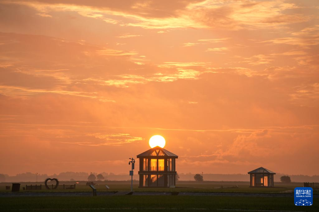 7月18日在富锦市万亩水稻公园拍摄的日出。