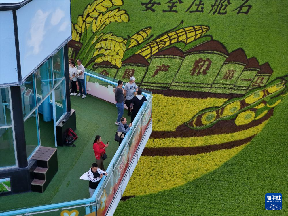 7月17日,游客在富锦市万亩水稻公园观光塔上欣赏稻田画(无人机照片)。