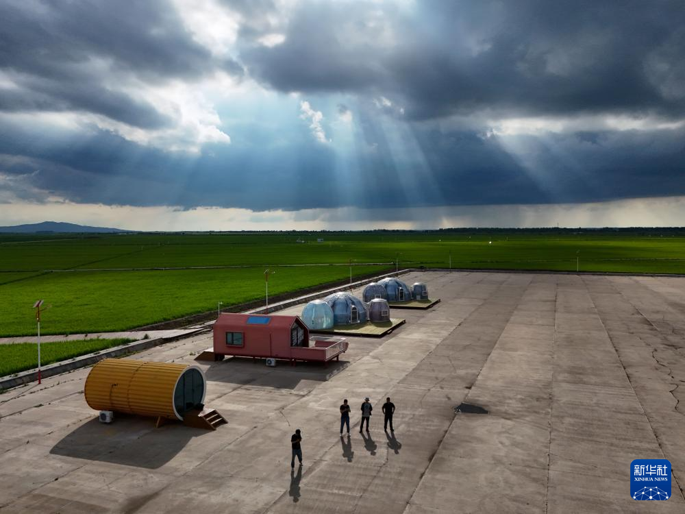7月17日在富锦市万亩水稻公园拍摄的星空下的宿营木房。