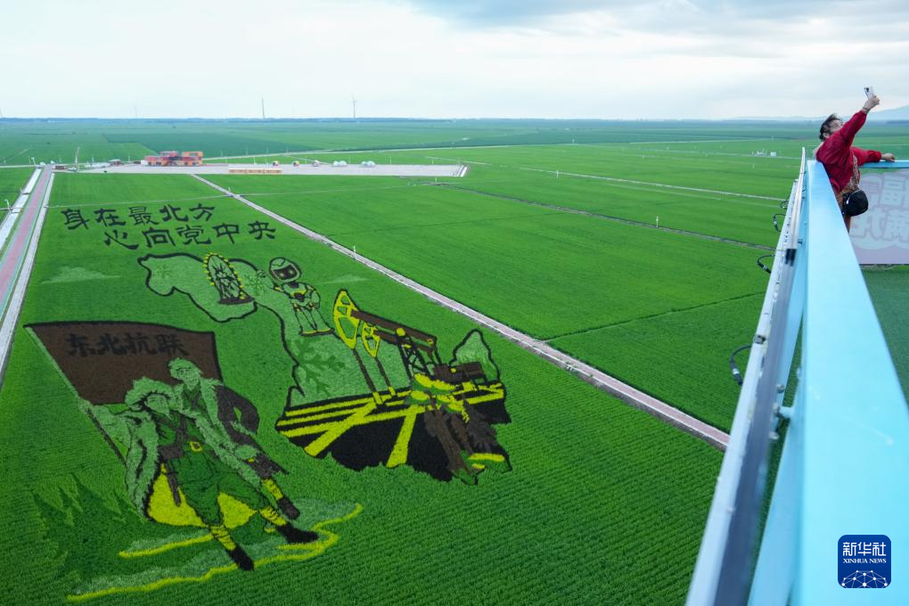 7月17日,游客在富锦市万亩水稻公园拍摄稻田画。