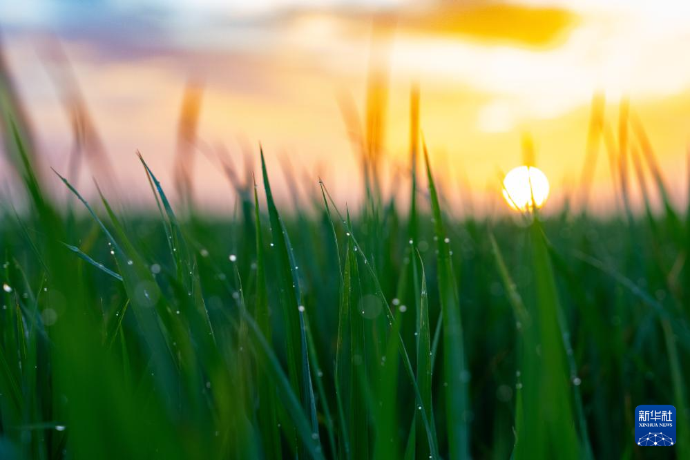 7月18日,富锦市万亩水稻公园稻叶上的露珠映衬着初升的朝阳。
