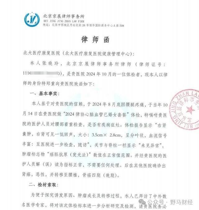 张晓玲是北京京展律师事务所的一位四十出头的律师。她称,作为北京律协会员,她长年享有北京律协为每位律师购买的体检服务。自己连续10年在爱康国宾设于北京的分院体检,未被检出患癌风险,2024年发现患癌时已是晚期。在接受媒体采访时,她提到自己十年的体检经历堪称“笑话”,并对爱康国宾的专业性和责任心提出了质疑。认为爱康国宾体检涉嫌“误检、漏检”,甚至直言爱康国宾的体检是“假体检”。