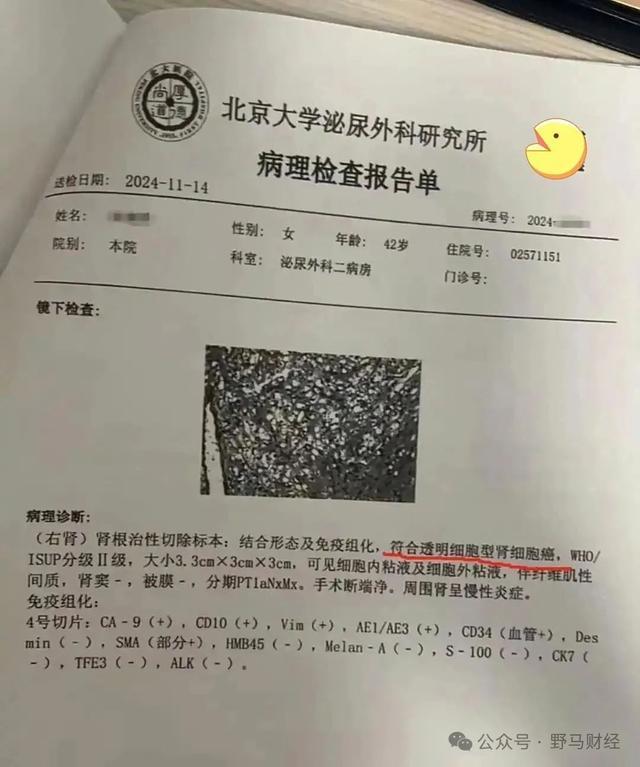 张晓玲随后在北京大学国际医院就医,并做了增强CT,结果提示右肾透明细胞癌。随后的手术切除了右肾,病理确诊为“透明细胞型肾细胞癌”。
