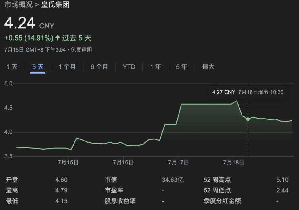 新茶饮上游供应链企业正以股价跳涨的方式,分享着这场狂欢的红利。本周,食品饮料板块早盘集体异动,浓缩果汁巨头国投中鲁此前在7月7日~11日连续5个交易日涨停,7月14日盘中也曾触及涨停;另一原料公司皇氏集团也在7月16日、17日连续涨停。