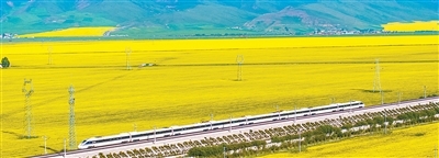 青海门源回族自治县,一列高铁动车驶过美丽的油菜花海。