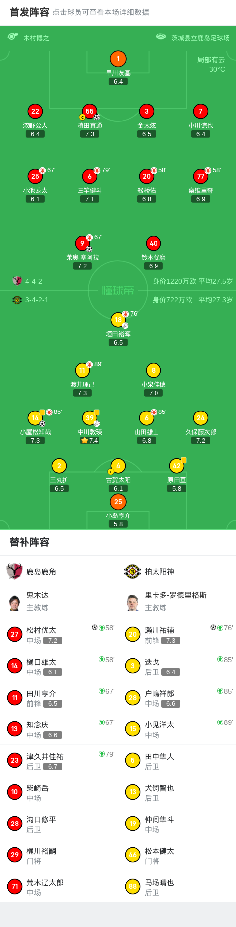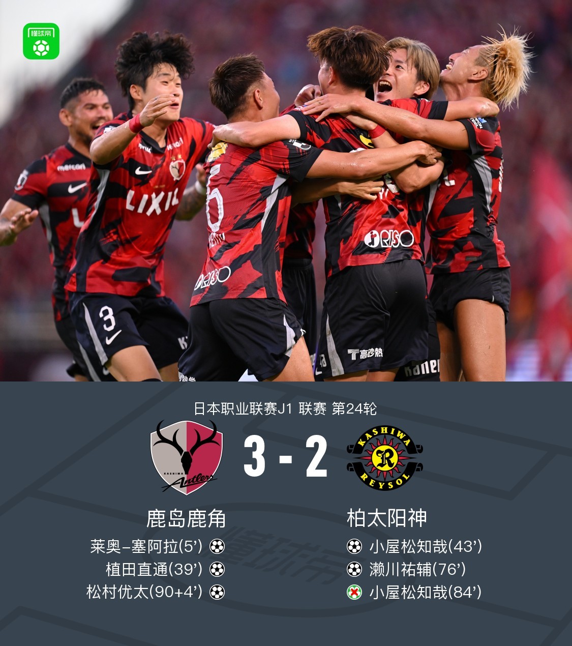 北京时间7月20日日本职业联赛J1联赛第24轮,鹿岛鹿角主场迎战柏太阳神。比赛中,鹿岛鹿角由莱奥-塞阿拉率先打破僵局,随后植田直通扩大比分,柏太阳神则由小屋松知哉接垣田裕晖助攻扳回一城。下半场,中川敦瑛助攻濑川祐辅破门,将比分扳平。随后小屋松知哉主罚点球未能命中,错失反超良机。比赛进入补时阶段,鹿岛鹿角由松村优太打入绝杀进球。最终,鹿岛鹿角以3比2战胜柏太阳神。