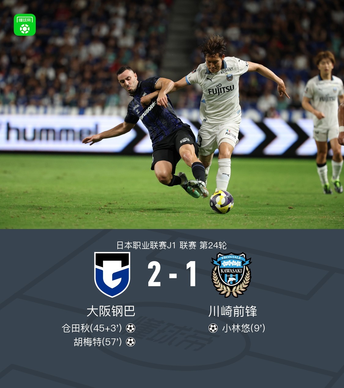 北京时间7月20日日本职业联赛J1 联赛 第24轮,大阪钢巴主场对阵川崎前锋。大阪钢巴仓田秋破门,胡梅特破门。川崎前锋小林悠破门。最终比分大阪钢巴 2-1 川崎前锋。