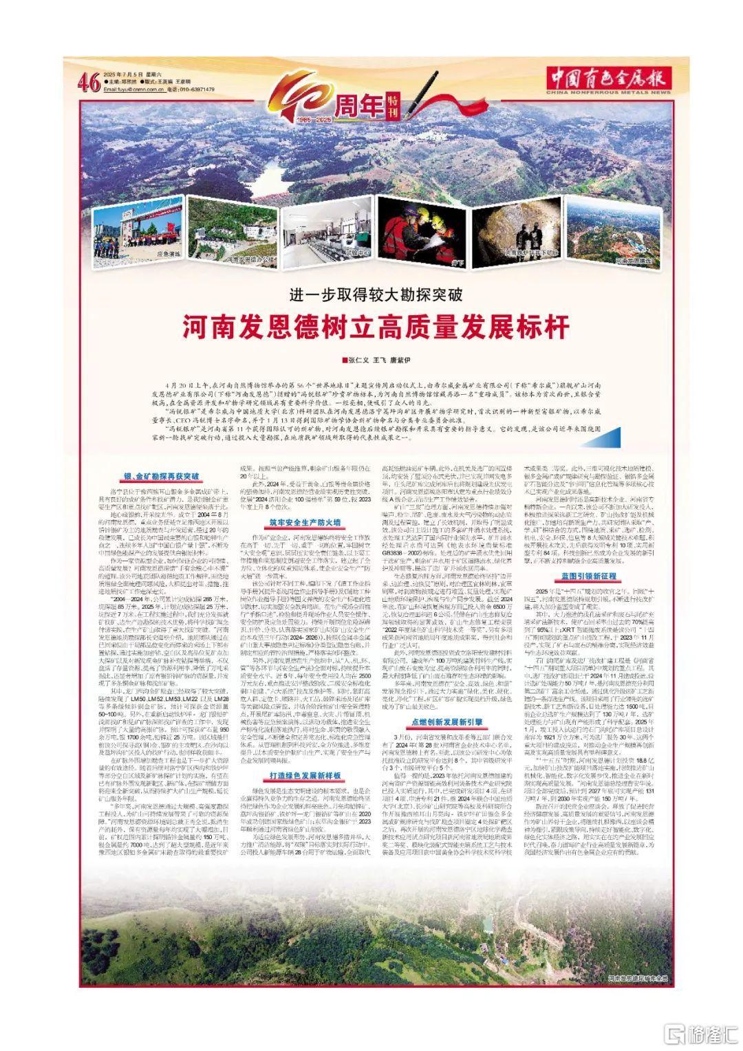 石门沟尾矿库及选厂技改扩建工程是《河南省"十四五"期间重大项目清单》中规划的重点工程。其中,选厂技改扩建项目已于2024年11月建成投运,设计选矿处理能力50万吨/年,是河南发恩德充分利用第二选矿厂富余工业场地,通过优化升级选矿工艺新建的一条浮选生产线。该项目采用了行业领先的选矿新技术、新工艺和新设备,日处理能力达1500吨,目前企业总选矿生产规模达到了130万吨/年,选矿处理能力与矿山现有产能形成了科学配套。2025年1月,竣工投入试运行的石门沟尾矿库项目总设计库容为1921万立方米,可为选厂服务30年。这两个重大项目的建成投运,对推动企业生产规模再创新高及实现高质量发展具有里程碑意义。