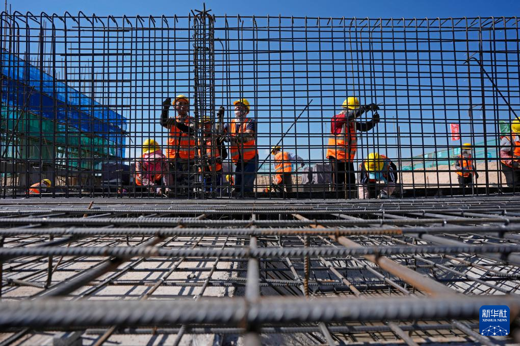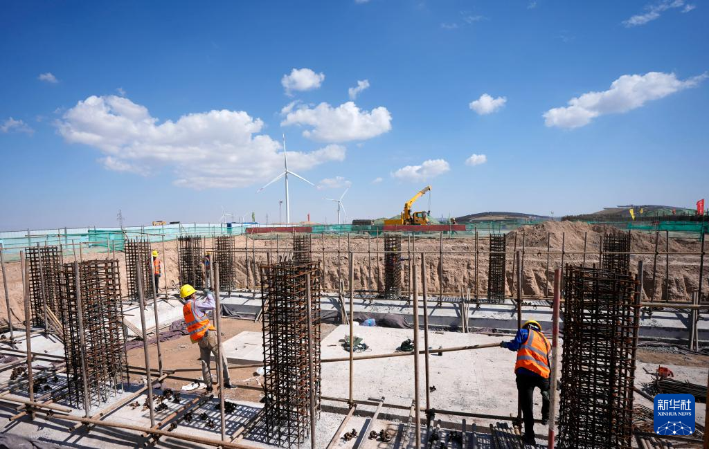 7月21日,中铁十一局工人在中卫300万千瓦光伏绿电项目3号330千伏变电站建设现场施工。