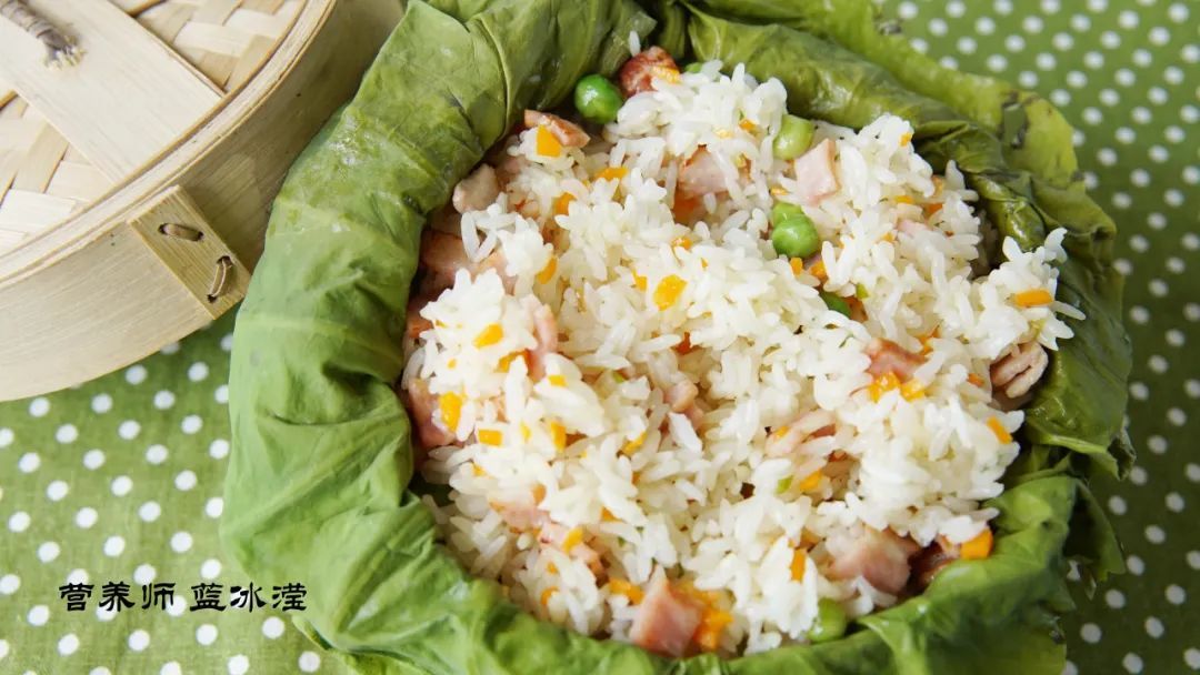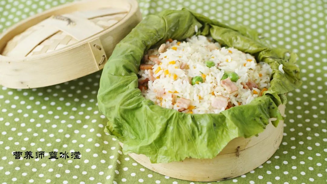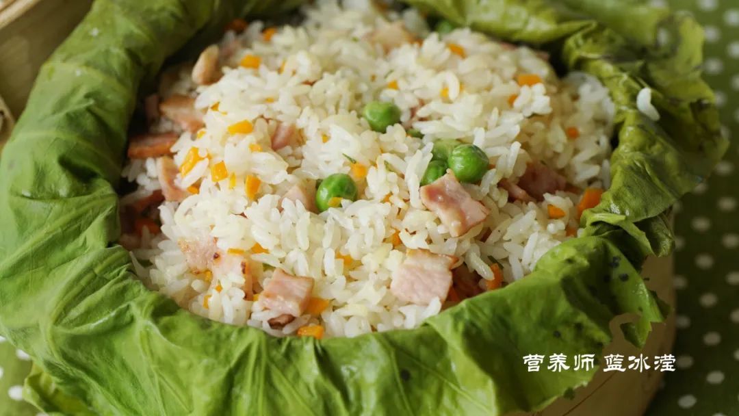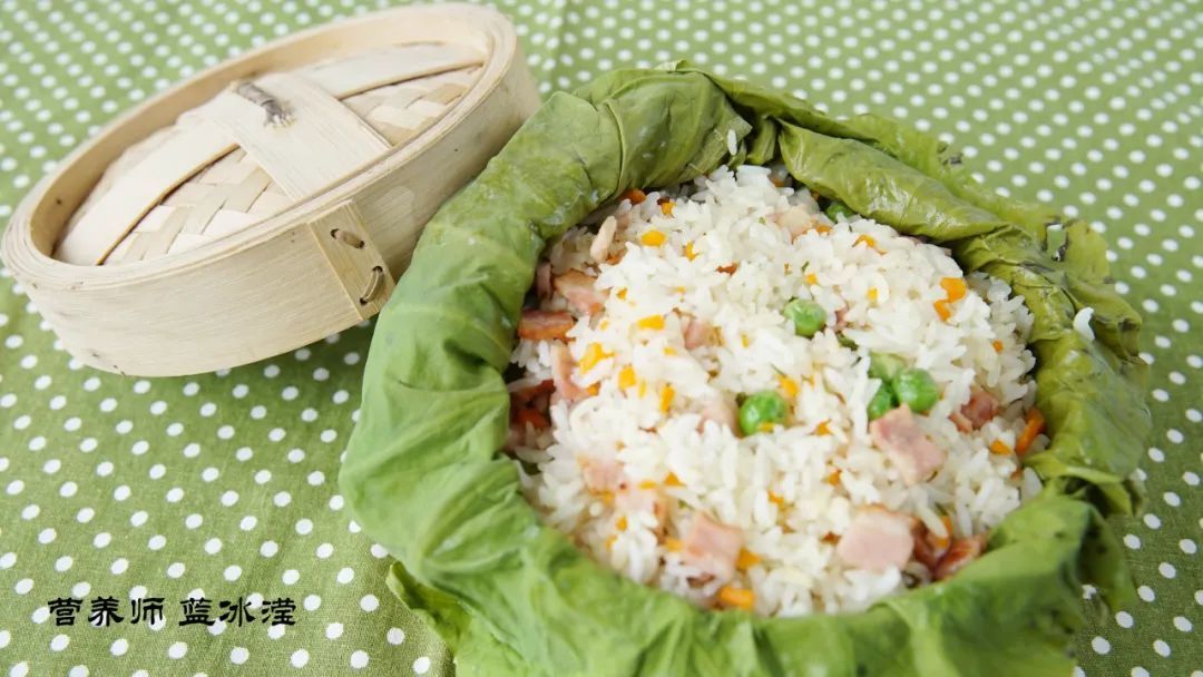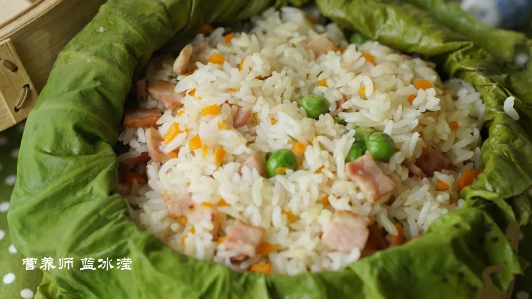 因为有了荷叶上锅蒸这一步骤,所以建议在炒饭过程中食材选择一些较为清爽的食材,不建议使用腊肉、熏肉等味道较重的食材,同时在蔬菜的选择上也是建议根茎类蔬菜,菜叶类蔬菜在蒸过后可能会影响口感。