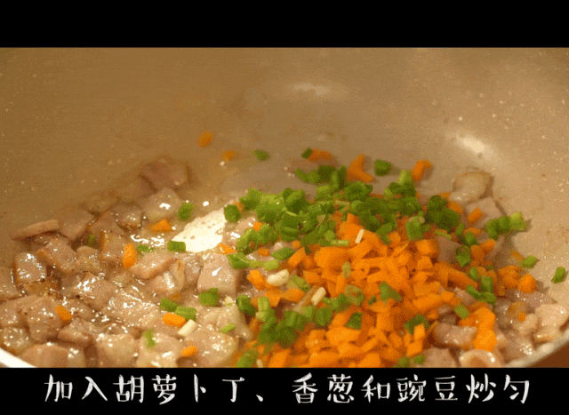 2,加入胡萝卜丁、香葱、豌豆、米饭和盐翻炒均匀