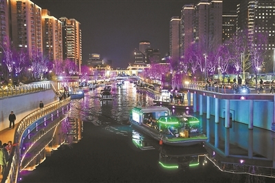 2021年开始运营的亮马河国际风情水岸项目,引入了丰富的文化元素,并借助5G、VR光影科技等技术,为市民游客打造出一个沉浸式的体验场所。当夜幕降临,亮马河畔的灯光全部亮起。五彩斑斓、随风景不断变化的灯光,将滨河两岸的游客带入了一个梦幻的世界。泛舟亮马河上,游客不仅能在好运桥下伸手可触摸头顶的彩色灯带,还能在船闸处观看全国唯一、科技感十足的铂宫闸室光影秀,以光影了解亮马河的前世今生与大运河文化带的深厚底蕴。