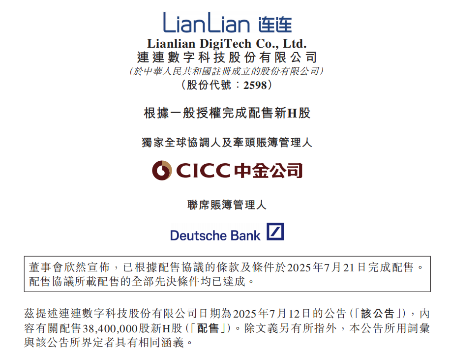 7月21日,连连数字科技股份有限公司(股份代号:2598)宣布,已成功按每股10.25港元的价格,向不少于六名独立承配人配售3840万股新H股,募集资金总额约3.94亿港元(扣除费用后净额约3.872亿港元)。此次配售股份占扩大后H股总数的8.40%,占公司总股本的3.44%。