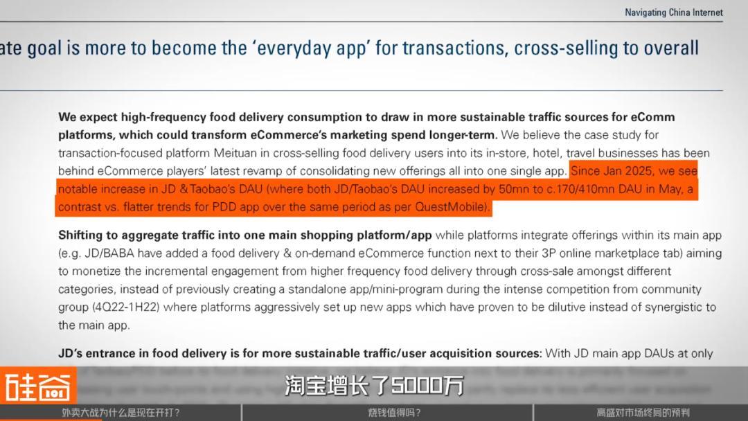 别小瞧这个手段,它是有一定成效的。根据QuestMobile的数据,自外卖战开打以来,京东和淘宝的日活跃用户数明显有增长,比如在5月,叠加618的预热,淘宝增长了5000万,而同期的拼多多,就没怎么增长。高盛说这个逻辑就跟当年美团,基于外卖和点评这个基本盘,把业务拓展到酒店、旅游业务一样,这是有成功先例的。