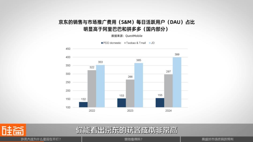 特别对于京东来说,京东现在最发愁的就是DAU不够,高盛研报里的这幅图显示,京东的获客成本非常高,几乎是拼多多的2.5倍。在京东2024年的营销支出中,有三分之二是用来获客的。所以京东切入外卖,一个核心目的就是增加主站流量。