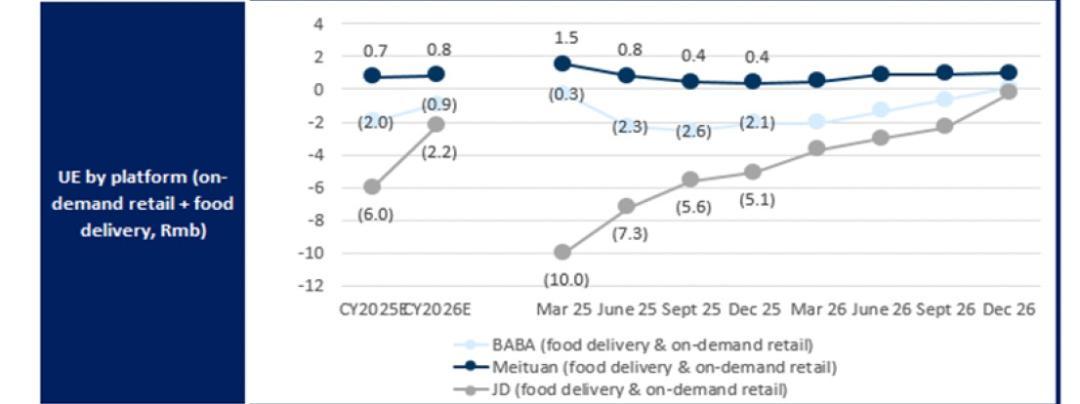 三家平台的UE模型浅蓝色-阿里巴巴;深蓝色-美团;灰色-京东数据来源:高盛