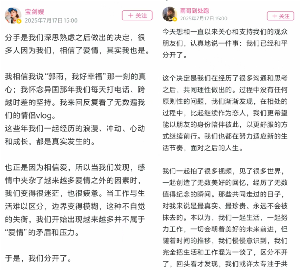 然而模范情侣的名号背后,是让双方都精疲力尽的生活状态,宝剑嫂与雨哥的分手公告中都提及了感情与工作相绑定带来的精神消耗。