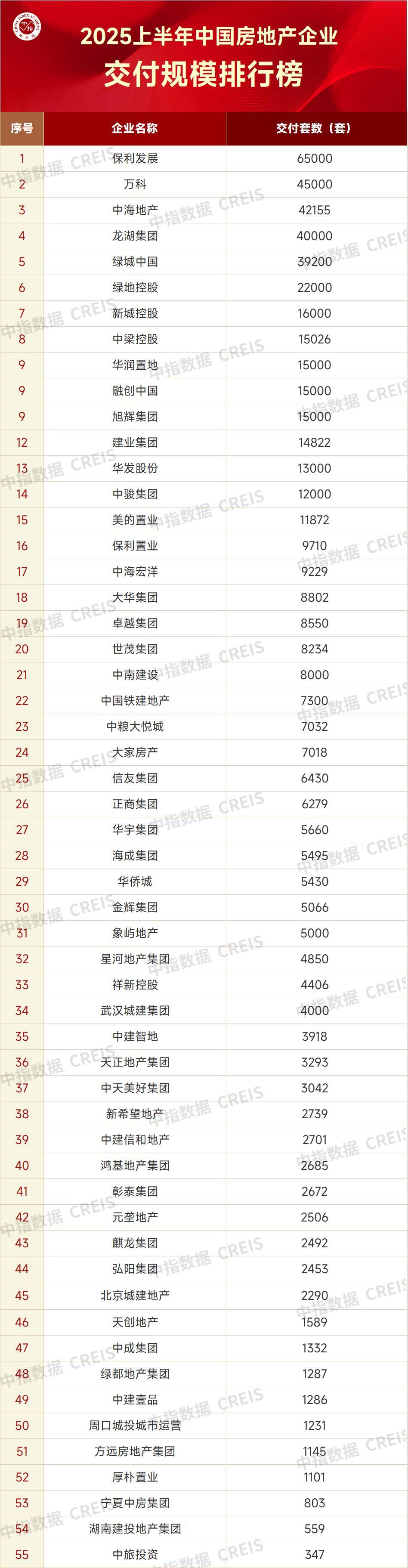 从企业交付套数来看,2025年上半年,1家企业交付套数超五万套,15家企业交付套数超万套。与上年同期相比,企业交付套数普遍下降,绿地、融创、建业等交付规模下降超50%。伴随着交付压力减轻,企业或将重启经营活动。