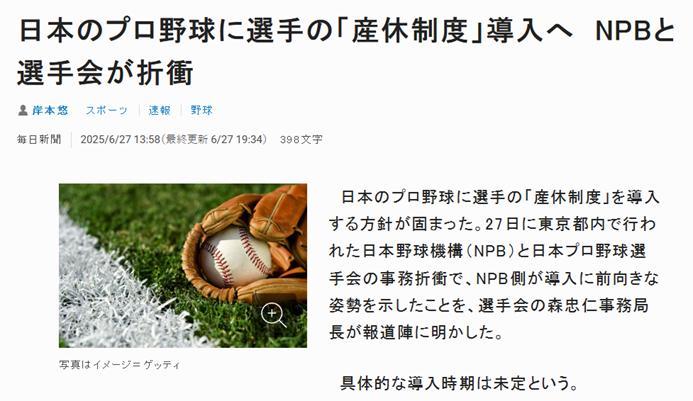 NPB与日本职业棒球选手会协定引入「产休制度」 图源:每日新闻