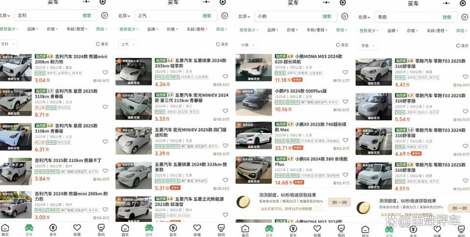 大家在诸多的二手车交易平台搜索,就可以看到很多大品牌车型的0公里二手车。像小鹏X9 2025款740超长续航Max版本在官网上的售价为37.98万元,而该车型百公里里程的二手车售价仅为33.71万元,直接88折出售;极氪MIX 2025款76度智驾版车型官网售价为27.99万元,在二手车平台上售价为22.88万元,便宜了超5万元,折扣为8折;哪吒L 2024款增程310闪充版,新车指导价为13.69万,平台售价8.98万……这样的车型数不胜数。