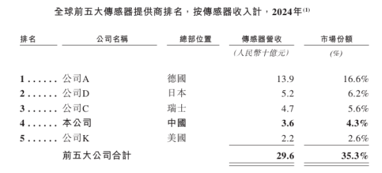 2024年,全球传感器市场规模达83.8十亿元人民币。其中,公司传感器营收位居全球第四,市场份额约4.3%。公司在中国传感器供应商中排名第一。